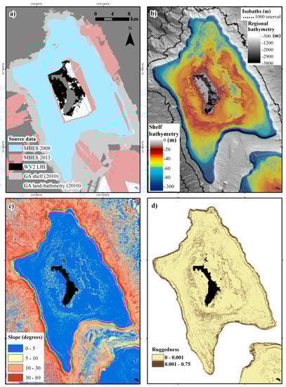 Lord Howe Island shelf: (a) Source data coverages for bathymetry model; (b) integrated high-resolution bathymetry model (regional grid shown, 8 m cell size). Colour scheme stretched to 100 m to emphasise shelf features. Isobaths displayed at 1000 m intervals (white dashed line) together with the 300 m isobath (shown in red) which represents the limit of the shelf bathymetry model; (c) slope calculated for the regional bathymetry model; (d) ruggedness (rugosity) calculated at a three cell window for shelf bathymetry model.