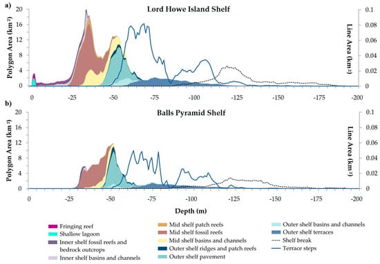 Zonal histogram for geomorphic features of the: (a) Lord Howe Island shelf; and (b) Balls Pyramid shelf. Line area represents the cumulative area of individual cells beneath the shelf break and terrace step lines, to provide an indication of depth distribution patterns for these linear features.