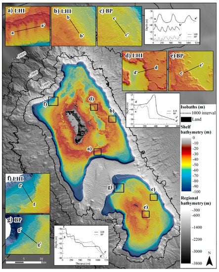 - Brooke, B.P.; McArthur, M.A.; Woodroffe, C.D.; Linklater, M.; Nichol, S.L.; Anderson, T.J.; Mleczko, R.; Sagar, S. Geomorphic features and infauna diversity of a subtropical mid-ocean carbonate shelf: Lord Howe Island, southwest Pacific Ocean. In Seafloor Geomorphology as Benthic Habitat: Geohab Atlas of Seafloor Geomorphic Features and Benthic Habitats; Harris, P.T., Baker, E.K., Eds.; Elsevier Science: Burlington, ON, Canada, 2012; pp. 375–386. [Google Scholar]