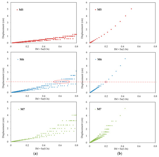 A given displacement demand can be associated with more than one earthquake scenario, and therefore several possible combinations of values of Sa(0.3s) and Sa(1.0s). For example, considering magnitude M6 it can be observed that a displacement demand of 1.6 cm can be associated with several distance-site class scenarios (data points) identified by Sa(0.3s) in Figure 3a or by Sa(1.0s) in Figure 3b. These scenarios correspond to data points scattered between 0.5 g to 0.7 g when using Sa(0.3s) as IM, and at the same time they correspond to a single value of Sa(1.0s) equal to 0.2g. In general, data points of the considered scenarios show considerably less scatter with Sa(1.0s) when compared to that with Sa(0.3s).