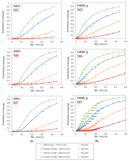 Implicit fragility functions for magnitudes M5, M6 and M7: (a) Steel braced frame (S2H-l); (b) Unreinforced masonry (URML-p). Continuous lines are relative to the building classes given in Table 3.
