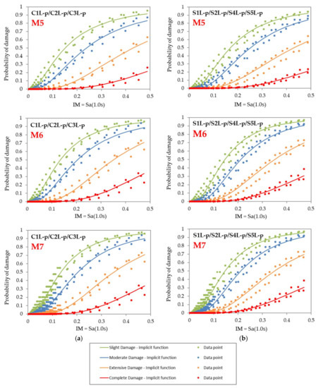 Implicit fragility functions for magnitudes M5, M6 and M7: (a) Reinforced concrete building class C (C1 + C2 + C3); (b) Steel building class S (S1 + S2 + S4 + S5). Continuous lines are relative to the building classes given in Table 3.