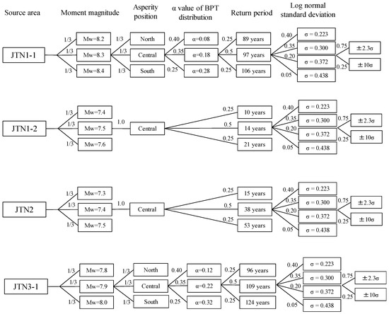 The numbers attached to the branches of the logic trees are the weights of each branch and the sum of all of the weights is set to 1.0. The weights of the branches containing the Mw range and asperity positions along the fault are set by equally dividing their weights. Regarding the branch consisting of the occurrence probability of the earthquakes, we use a weight of 0.50 for the central branch and 0.25 for the branches at both ends to consider the confidence interval. The weight value adopted in Annaka’s study [10] is also adopted for the weights of the branches for the standard deviation of the lognormal distribution and the truncation range.