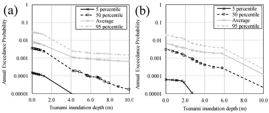 First, in each case of the tsunami numerical simulation, we assumed that the probability density of the tsunami wave height was equal to the probability density of the inundation depth. Then, after normalizing the probability density of the inundation depth so that the maximum value of the annual exceedance probability of the inundation depth represents the annual exceedance probability of the tsunami wave height in the case where the inundation depth is zero, we calculated the annual exceedance probability of the inundation depth from the corresponding probability density data (see Figure 12). From Table 6, Table 7 and Table 8, the tsunami wave height (in the case where the inundation depth at each evaluation point is zero) and the annual exceedance probability are respectively 2.01 m and 0.007986 (average value) for Soma, 4.30 m and 0.006729 (average value) for Sendai and 3.63 m and 0.004062 (average value) for Kesennuma. In this study, although the procedure is not entirely probabilistic because the tsunami numerical simulations are performed only discretely with a limited number, we constructed the annual exceedance probability curve of the inundation depth by regressing each plot with a straight line. The average values in addition to the 5th percentile, 50th percentile and 95th percentile curves created using the same method are also shown in Figure 12.