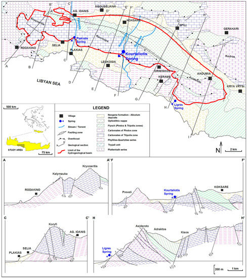 Geological map and structural cross-sections of the region. The black square on the inset map indicates the study area. The Kourtaliotis spring catchment is delineated in the figure by the red line.