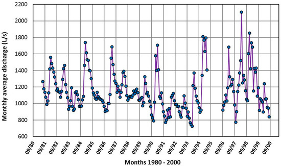 Records of Kourtaliotis spring discharge are referred to the period 1981–2000, with a small gap from July 1995 to August 1996 (Figure 2). It is shown that the outflow varies from 725 to 1809 L/s; the minimum rate is measured in September or October, and the maximum in April or May.