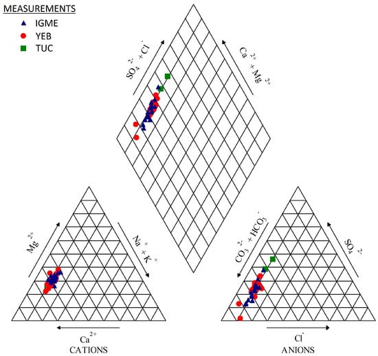 The classification of groundwater samples is illustrated in Figure 3 by a trilinear plot (Piper diagram). It indicates that the groundwater is of the calcium bicarbonate (Ca2+–HCO3−) type, and meets drinking-water standards [29]. The increased concentration of Na+ is attributed to water circulation through flysch and flyschoides formations exposed in the study area.