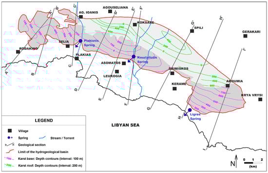 Groundwater with a potentiometric gradient of about 23.5‰–3.5‰ (during summer and winter respectively) feeds the springs which drain at the southern edge of the carbonate outcrop (Figure 1), with a total flow rate of about 1.4 m3/s. The measurements taken by Land Reclamation Service (YEB) and Institute for Geology and Subsurface Research (IGME), were available by Decentralized Administration of Crete (2013) [26].
