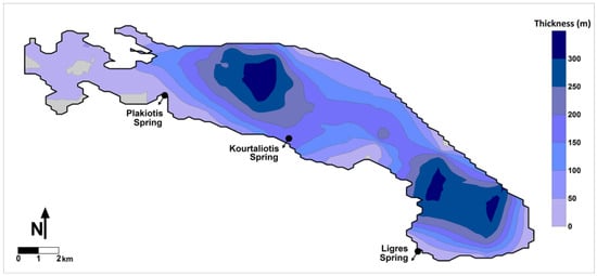 Hydrogeological investigations in the area recognized two more water outlets with lesser discharge rate, namely Plakiotis and Ligres springs (Figure 1). The estimated average annual discharge is 3.5 × 106 m3 for the Plakiotis spring and 2.4 × 106 m3 for the Ligres spring [26]. The latter spring is a permanent spring, and it is located 9 km south east of Kourtaliotis outflow, at elevation 50 m a.s.l.