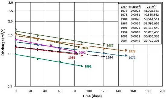 The hydrograph data of the Kourtaliotis spring was analyzed for the years between 1973 and 2006, by the best fit of the observed curves with the Maillet’s equation. In detail, the hydrograph data of the spring were plotted on semi-logarithmic graphs and the recession coefficients (α) were estimated by Equation (4). Results referring to representative years are presented in Figure 6.