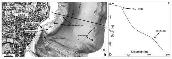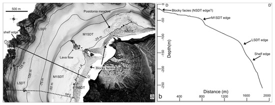 (a) the shallowest terrace (near-shore submarine depositional terrace, NSDT hereafter) has the edge at water depths of ca. 10–25 m (on average 15 m) and is morphologically recognizable all along the island, even if it is more evident in the eastern and south-eastern sectors (NSDT in Figure 2 and Figure 3, respectively). This terrace commonly shows an uneven morphology due to the alternation of smooth areas (corresponding to sandy seafloor with ripples, as deduced from direct check or through backscatter data) and blocky facies (often forming small ridges parallel to the coastline) or Posidonia Oceanica meadows (Figure 2, Figure 3 and Figure 4), widely diffused on the terrace top.