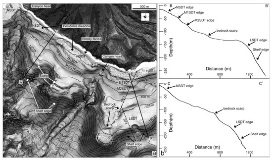 (a) Shaded relief map of the SE sector of Salina (location in Figure 1a), where a large shelf with different orders of submarine depositional terraces are present; (b) the bathymetric cross sections B–B1 and C–C1 evidence the edge depth of the shelf and overlying terraces. Note also the presence of two deeply indenting canyons that cut the shelf in very shallow-water areas, some tens of meters far from the coast. NSDT: near-shore submarine depositional terrace; M(1/2)SDT: mid-shelf submarine depositional terrace; LSDT: shelf-edge (lowstand) submarine depositional terrace. SP3 and 4 are the trace of the Sparker profiles shown in Figure 6.