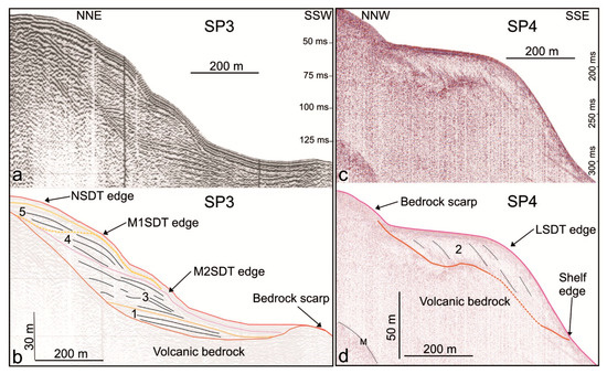 On seismic profile, this terrace is associated to seismic unit 2, characterized by a marked prograding geometry, with steep foresets (8°–20°) or with weakly transparent facies. Where very steep, these foresets cannot be imaged on seismic profiles since they appear acoustically transparent (see SP4 in Figure 6; see also [28]). This unit mainly lies above the volcanic bedrock, in the sectors where the erosive shelf edge is deeper than 160 m (section B–B’ in Figure 3 and SP2 in Figure 5; section D–D’ in Figure 4 and SP4 in Figure 6c,d). The seismic unit 2 shows a variable thickness, reaching a maximum value of 27 m in the SE sector.