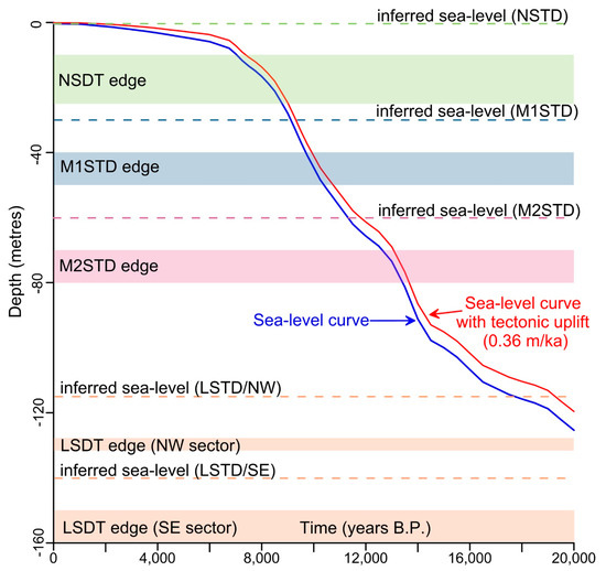 By applying the same genetic model to the deeper terraces, they can be interpreted as prograding wedges formed during stillstands, when the sea level was lower than the present-day. According to the sea-level curve of [34] and assuming similar meteo-marine conditions also for past sea-level conditions (on average 15 m for the storm-wave base level), the mid-shelf terraces 1 (edge at 40–50 m water depths) and 2 (edge at 70–80 m water depths) could have formed during the final and intermediate part of the transgressive phase (Figure 7). Even if we are aware that meteo-marine conditions could have been different during the Pleistocene and Holocene, as witnessed by some storm-wave deposits in the central and western Mediterranean [35,36], the possible difference in the depth range of ± 10 m is not enough to significantly change their stratigraphic attribution. Finally, the deeper shelf-edge terrace (edge at 130–160 m water depths) could have formed during the last lowstand at around 20 ka (Figure 7), before the sea level rapidly rose. However, the depth variability of its edge is quite large and suggests the possible role of post-depositional vertical movements (discussed in the next section), although a part of this variability could be also due to the different oceanographic regime between the two sectors.