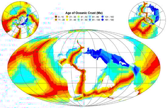 - Müller, R.D.; Sdrolias, M.; Gaina, C.; Roest, W.R. Age, spreading rates, and spreading asymmetry of the world’s ocean crust. Geochem. Geophys. Geosyst. 2008, 9, 1–19. [Google Scholar] [CrossRef]