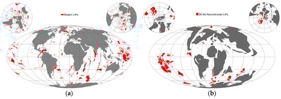 Distribution of Large Igneous Provinces (LIPs) in the ocean basins. (a) Modern; (b) 94 Ma.