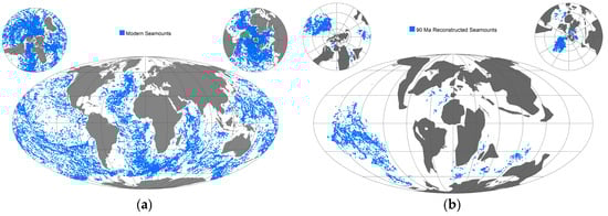 Global Seamount Database: In this study, the seamounts from the Global Seamount Database [] are used, which is based on satellite-derived vertical gravity gradient (VGG) data with globally 24,643 potential seamounts that are higher than or equal to 0.1 km, and located away from continental margins. The modern distributions of these seamounts (Figure 3a) were rotated back to 94 Ma (Figure 3b).