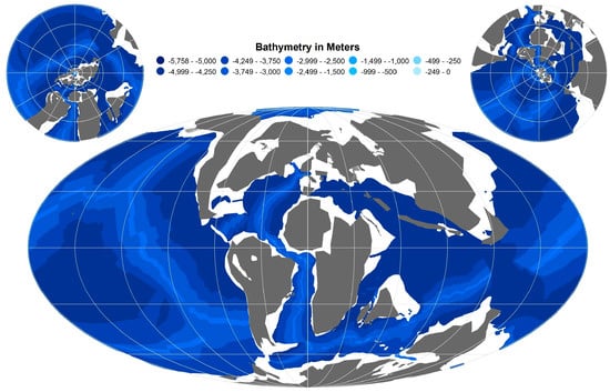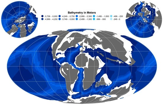 - Scotese, C.R. Atlas of Late Cretaceous Paleogeographic Maps, PALEOMAP Atlas for ArcGIS, Volume 2, The Cretaceous, Maps 16–22, Mollweide Projection, PALEOMAP Project, Evanston, IL; Technical Report for PALEOMAP Project: Evanston, IL, USA, 2014. [Google Scholar]