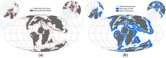 The extent of different 94 Ma ocean boundaries. (a) The maximum extent of the ocean crust in the ocean basins; (b) the extent of 94 Ma land, shelf, slope, and rise.