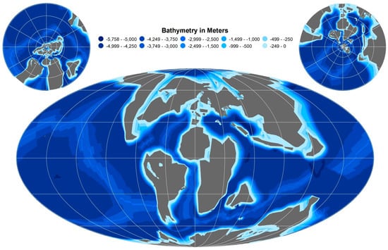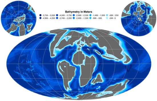 The paleo-shoreline model used in this reconstruction was obtained from the C–T paleo-DEM obtained from the PALEOMAP Project []. In this model, a zero meter coastline was extracted from the paleo-DEM to be used along with the EB08 ocean age grid map. When the extracted continental shorelines from the PALEOMAP Project reconstructions were incorporated into the EB08 CT age grid, there was a very small difference in the rotation of the continental South America block. This was manually adjusted to match with the EB08 grid.