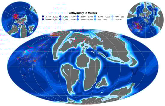 The maximum depth of the C–T open ocean region was about 5758 m, with a mean depth of 3262 m and median depth of 4080 m. C–T open oceans were shallower compared with modern open oceans. But looking at the median depth of the C–T open ocean was slightly deeper than that of the modern open oceans. In this regard, one of the final processing steps involved kriging interpolation to eliminate outlier calculation points. The total number of such points (19,285) was very small compared to the total number of points that define the entire C–T open ocean (4,498,703), i.e., less than 0.29%. Positive bathymetric values were changed to 0 using kriging type interpolation methods. Figure 9 shows the distribution of such points on top of the Interpolated 94 Ma reconstructed bathymetry (Figure 8).