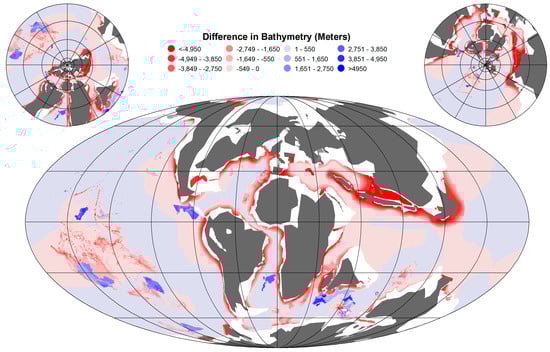 The addition of sediment and an isostatic correction from sediment loading of the depth-to-basement oceanic crust (e.g., []) is critical to complete the bathymetric reconstruction of the open ocean region. A parameterized multilayer sediment cover, called “OES sediment thickness”, based on a third-degree polynomial fit between area corrected global sediment thickness data of modern oceans and marginal seas [,] and the age of the underlying oceanic crust [], was isostatically added on top of the depth-to-basement. The sediment loading approach used here is similar to procedures used by Crough [] and Sykes [], was adopted using a multicomponent sediment layer with varying sediment densities calculated from a linear extrapolation of published sediment densities []. Once the sediment loading was added, the reconstruction of the open ocean regions was considered complete (Figure 5), and ready for merging with shelf-slope-rise structures, and adding LIPs, plateaus and seamounts, as will be described next.