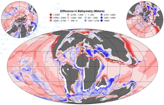 Another interesting comparison can be made with the C–T bathymetric model of Sewall [] (SW07). The SW07 model is available in a 64 × 128 grid size, and here is resized to 1801 × 3601 (Supplementary Figure S2) in order to compare with the OES model. The SW07 model also contains topography; only values less than or equal to zero were considered for comparison (Figure 11). The statistical comparison between the OES and SW07 models indicates some fascinating similarity. The minimum, mean and median depths are within 10% of each other. The modal depth, however, is very different, in OES bathymetry being very shallow (6.5 m), while that in SW07 is very deep (5040 m). The standard deviations of these two models are 10% (OES) and 20% (SW07). In the SW07-OES difference map (Figure 11), regions with positive values indicate deeper depths in OES. Most of the disagreements are in the continental shelf-slope-rise regions and may be attributed to the shelf-slope-rise structure of the OES model. There are also some differences in the depth of mid-oceanic ridges: in OES, the mid-oceanic ridges are much shallower than in SW07. Both models include a larger and more open North Atlantic Ocean; extensive Cretaceous interior seaways in North and South America, North Africa, and Eastern Europe, and a narrowly open South Atlantic Ocean.