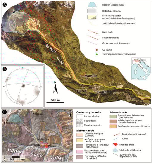 The Rotolon DSGSD, which is already included in the 2008 DSGSD inventory [4], covers an area of approximately 450,000 m2 and has a drop height of 600 m (from approximately 1700 m to 1100 m above see level). It overtops a narrow poorly populated s-shaped valley that is often threatened by rapid channelled landslide occurrences (Figure 1). Such deformational activity develops in the uppermost portion of a sub-horizontally bedded, intensively fractured, mainly dolomitic limestone stratigraphic succession belonging to the South Alpine Domain (middle Triassic to lower Jurassic in age) [15,25]. The geological formations, from bottom to top, are the Mt. Spitz Limestone (massive, locally layered limestones), Raibl Formation (a sequence of conglomerates, sandstones, marls and dolomitic evaporates that show a discontinuous level of riolitic-dacitic porphyrites at the bottom), and Dolomia Principale (dolostones and dolomitic limestones). Two main low-displacement fault systems (NE-SW and NNW-SSE oriented) and a third one (E-W oriented) intersect the area (Figure 1A) [35]. Structural discontinuities with the same geometric pattern were also identified by photo interpretation on the west rocky massif bordering the studied area (Figure 1A) and along the ridge next to the main crown (Figure 1B) by collecting the orientations of discontinuities [38,39]. Such a spatial distribution and related structural constraint contributed to develop the current amphitheatre shape of the DSGSD and influenced the deformational character of the entire slope.