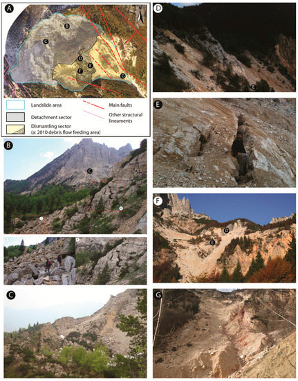 (A) View of the western portion of the DSGSD 2010 crown and (B,C) details of some areas. Photos (B) clearly showing the fresh/newly activated surface near the crown area caused by the 2010 reactivation were taken on 8 November 2010, four days after the debris flow. (D) Details of the north portion of the DSGSD 2010 crown. (E) Overview of the crown and proximal area. (F) Details of ancient smooth surfaces from rubbing in the rupture and sliding crown area and related lineation. Their discovery locations are shown in (A,E).