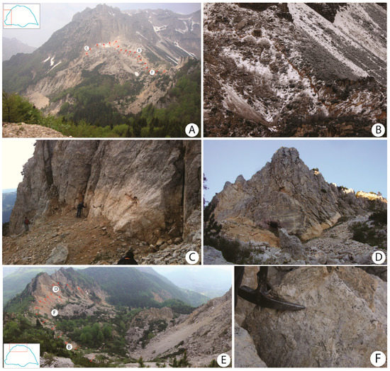 Many linear landforms that are related to the relaxing consequences of gravitational action such as tensional fractures along scarps (Figure 2B (ii)), trenches and crests (Figure 2C) that are largely associated with colluvial, rockfall and rock avalanche materials with very coarse and heterometric clasts and scattered boulders (Figure 2B (i)) are widely recognized and mapped in the detachment sector [15,25]. No evidence of glacial phenomena has been identified in those materials, even though active earth-shaping agents such as karst phenomena, which are able to rapidly modify the territory with their own morphological forms, are absent. Even glacial deposits are absent here, and according to Altieri [35], they are only distributed in a narrow south-east area of the basin outside the DSGSD. Toe bulging structures such as tilted mega blocks and subvertical open fractures (Figure 2D,E) have instead been documented in the dismantling sector through some outcrops. In fact, a large and thick loose detritus mantle originated by short-term surface processes is predominant and widespread in the bulging sector and masks the continuity of the local deformations, especially in the lowermost portions (Figure 2F,G) [16,25]. In this area, however, no well-denoted slip surface associable with other types of possible mass movements (e.g., rockslides) has been found or directly and indirectly outlined by topographic examinations. Therefore, the evidence of extensional and compressive processes in the uppermost and lowermost parts of the landslide, respectively, joined with the rough morphology suggest that the Rotolon DSGSD can be classified as Sackung [7,15]. Moreover, regarding its general structure, this slope deformation can be classified at the limit between large landslides and DSGSDs on the basis of the area-frequency statistics proposed by Agliardi et al. [3].