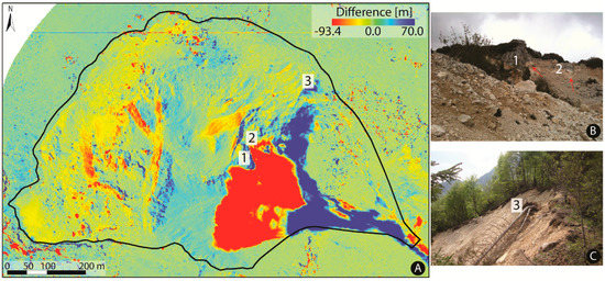 (A) DoD map; (B) photo of the eastern portion of the 2010 debris flow source area, which clearly shows the surficial movements (red arrows) that occurred at the toe of the megablocks (1 and 2), and (C) photo of upper portion of the positive anomalies (3).