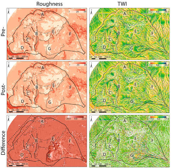 The pre- and post-DEM aspect and slope maps are shown in Figure 5, and the roughness and TWI maps are shown in Figure 6. Maps of the differences of these four parameters are also presented in both figures. The maps clearly show that the morphological changes occurred in the entire DSGSD, not just in the area affected by the 4 November debris flow (G in Figure 5 and Figure 6). Six main areas (A–F in Figure 5, Figure 6 and Figure 7) were identified based on the distribution of the surface irregularities. According to the detailed geomorphological map [15], these areas were identified as follows: