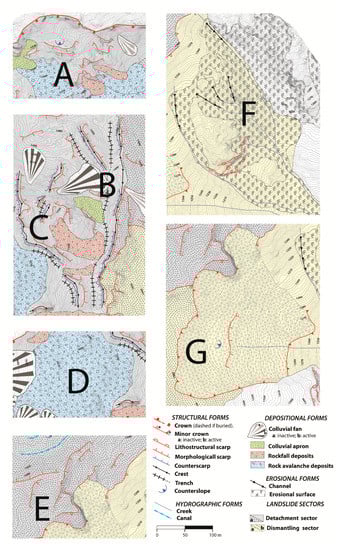 - E is in the middle-east portion between the detachment and the dismantling sectors, where there are the minor crow and morphological scarps (Figure 7); and