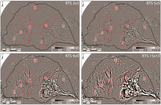 Moreover, maps of residual topographic surface (RTS, [55,56]) were also calculated to highlight the fine scale landforms. These maps were obtained by subtracting from the 2 m × 2 m DEMs a smoothed map created by averaging the values within an n-cells moving window such that each cell of the smoothed DEM has a value that corresponds to the mean of the n2 neighbourhood cells values [55].