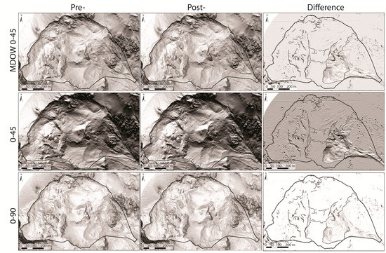 Pre- and post-hillshades obtained by simulating illumination from the north (0-) with altitude angles of 45° and 90°. The MDOW hill shade was obtained by simulating the primary illumination from the north with an altitude angle of 45° (see the procedure in the text). A–G localize the areas affected by the main morphological changes. The black lines in the difference maps highlight the gravity-related forms (e.g., minor crowns, lithostructural and morphological scarps, counterscarps, crests, and trenches).