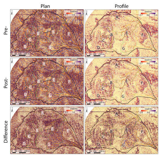 The plan (along the line of intersection between the surface and an XY plane) and profile (along the line of maximum slope, where the surface is intersected by the plane formed by the aspect and the Z-axis) curvatures are shown in Figure 10, and the tangential (along the line orthogonal to the line of steepest gradient) and total (general measure of the curvature of the surface itself, rather than the curvature of some line across the surface) curvatures of the pre- and post-DEMs and their differences are shown in Figure 11. Positive values of the plan and tangential curvatures describe how water would diverge as it flows over this point, and negative values show how it converges. Profile curvature describes how water would accelerate (negative values) or decelerate (positive values) flowing over a point, and total curvature is always positive and could be a measure of landscape ruggedness. The plan curvature has very low values except for the six areas (A–F), where the canals and the creeks north-west of area F and the morphostructures of the other areas are clearly recognizable. Canals and creeks are also well defined by the tangential curvature, which together with the profile curvature, shows a very complex situation over the entire landslide. The profile curvature well enhanced the morphostructures in the western part of area E. The pre- and post-total curvatures show that the main roughness is in the already defined six areas (A–F), and the difference map clearly shows that all these areas were affected by changes after the 2010 reactivation.