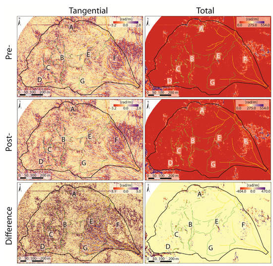Pre- and post-tangential and total curvatures and their differences. A–G localize the areas affected by the main morphological changes. The light green lines highlight forms related to gravity (e.g., minor crowns, lithostructural and morphological scarps, counterscarps, crests, and trenches), and the yellow lines represent the creek and the artificial channels.