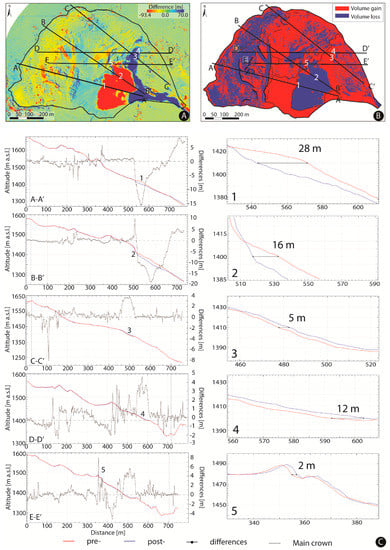 (A) DoD map, and (B) map of the volume gain and loss. A-A’, B-B’, C-C’, D-D’, and E-E’ are the pre- and post-elevation sections shown in detail in (C). 1–5 are zooms of the point indicated in the maps and in the sections.