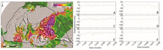 Total GB-InSAR displacements over the RTS15 × 15 map and main displacements of the A–F areas.
