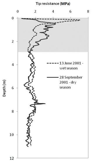 The typical trend of the tip resistance within a partially saturated clayey soil is shown in Figure 1. This figure shows the tip resistance for two tests carried out at the same location with two different water table depths [5,7]. The deposit was homogeneous and on the basis of laboratory testing on undisturbed samples retrieved from the first three meters was mainly classified as CL (low plasticity clay) to CH (high plasticity clay) according to the USCS classification system. The water table was found at a depth of 3.5 m during the wet season (June 2001) and at a depth of 5 m during the dry season (September 2001). Despite the homogeneity of the deposit, it can be observed that the tip resistance (qc) is influenced to a great extent by the water table depth (due to suction) so that qc increases from 1–2 MPa to 3–4 MPa in the vadose zone above the water table (Figure 1). As can be observed, such an increase is higher during the dry season.