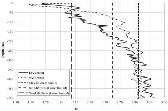 Ic index from CPTu at Broni (PV, Italy) (Water table depths at 3.5 and 5 m during dry and wet seasons respectively) [5].