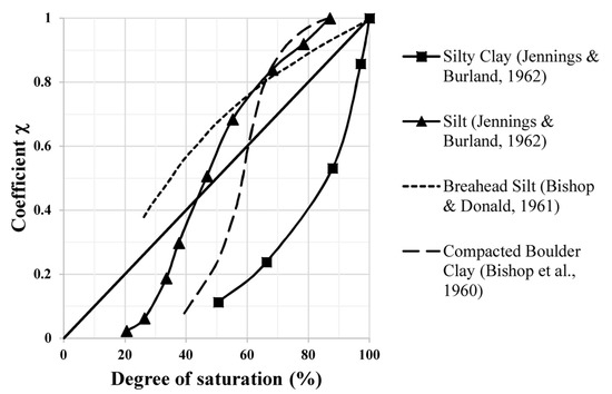 In order to properly use Equation (7) the value of χ should be assessed on the basis of the actual degree of saturation of the soil layers above the water table. The relationship between χ and Sr (Figure 3) is available in literature for different soil types (e.g., [11,12,13]). More recently, Konrad and Lebeau [14] related the effective stress parameter (χ) to an effective degree of saturation, which is linked to the capillary component of water retention. Nevertheless, the applicability of the methodology developed in [14] has been validated for non-plastic soils.