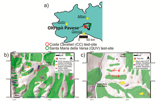 (a) Location of the two test-sites in northwestern Italy; (b) landslides map and main geomorphological features of Costa Cavalieri site; (c) landslides map and main geomorphological features of Santa Maria della Versa site.