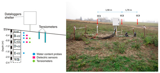 In this site a hydrological monitoring station (Figure 5) was installed since 27 November 2015 (Bordoni et al. [20]). Data were recorded every 10 min. The monitoring station included water content probes, tensiometers and dielectric sensors. GS3 probes (Decagon Devices Inc., Pullman, WA, USA) were installed at 0.2, 0.4, 0.6, 0.9 and 1.7 m from the ground surface for the measure of the water content. A combination of different devices was used for measuring pore water pressure: two tensiometers (T4e UMS GmbH) and three dielectric sensors (MPS-6 Decagon Devices) were installed at 0.4, 0.6 and 0.9 m from ground level. Tensiometers were installed to measure pore water pressures higher than −101 kPa, while the other pore water pressure devices allow to measure pore water pressures lower than −101 kPa (Bittelli et al. [21]). The monitoring system was equipped with a datalogger (DL-6te, EM-50) powered by batteries.