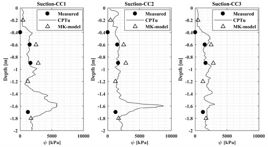 Some increase in suction values around depth of 1.6 m in CC1 and CC2 (Figure 7) is predicted using the CPTu-based method. Nevertheless, this is simply due to the locally high tip resistance (qc) values in CPTu-CC1 and CPTu-CC2 at a depth approximately equal to 1.6 m (heterogeneous layer). The same does not happen in CPTu-CC3 case.