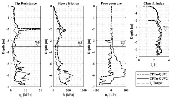 CPTu tests were carried out close to the QUV1 and QUV2 open pits, through a Pagani Penetrometer model TG63-150kN and according to ASTM D5778 [22]; the acquisition system/data logger was TGAS-08. Silicone oil was used for saturation of the filter. Bronze Filter saturation process was done previously using a professional vacuum pump for 24 h at Pagani Company.