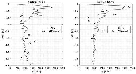 Similar observations can be done as far as the CPTu tests at QUV site are concerned. In this case, the CPTu-based suction values mimic those predicted by the MK model but exhibit some discrepancies especially at depths in between 0.3 and 1.0 m (Figure 8 and Figure 9). Unfortunately, the experimental measurement of suction at QUV site was not available and therefore it was not possible to establish if such discrepancies depend on limitations in the use of the MK model or of the proposed method.