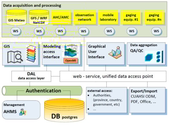 Flow-chart of local AHMS server (AHC/AMC—automatic hydrological/meteorological complex, WS—windows service; DAL—data access library, QA/QC—quality assurance/quality control).
