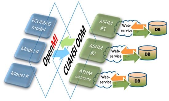 The ASHM-ECOMAG integration is based on the OGC OpenMI 2.0 (.NET wrapper) and web-service technologies. The data exchange is organized in a two-level scheme (as seen in Figure 3). The first level provides the external interaction between all components of the integrated system using the OpenMI standard. Regardless of their roles, all the units of the system implement the basic, standard interface and can be combined according to the plug and play principle while also exchanging data during the runtime. The second level of integration through OpenMI wrapped SOAP web-services and the DAL (data access layer) library provides the cross-platform interaction for operation with the distributed ASHM data storage system. Thus, this software architecture enables external control during runtime progress under observance of the data integrity condition.