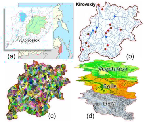 Upper Ussuri River Basin position (a) and information set; (b) observational network (red circles weather stations, blue circles hydrological gages); (c) ECOMAG model unit schematization and (d) DEM, soil and vegetation map coverages.